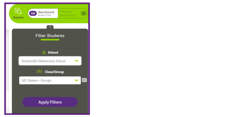 You can use the filter to select a specific school and/or class (for users with school/district-wide access). Ensure you have either Benchmark or Progress Monitoring selected, depending on what you are assessing.