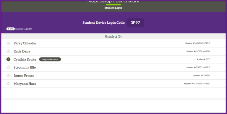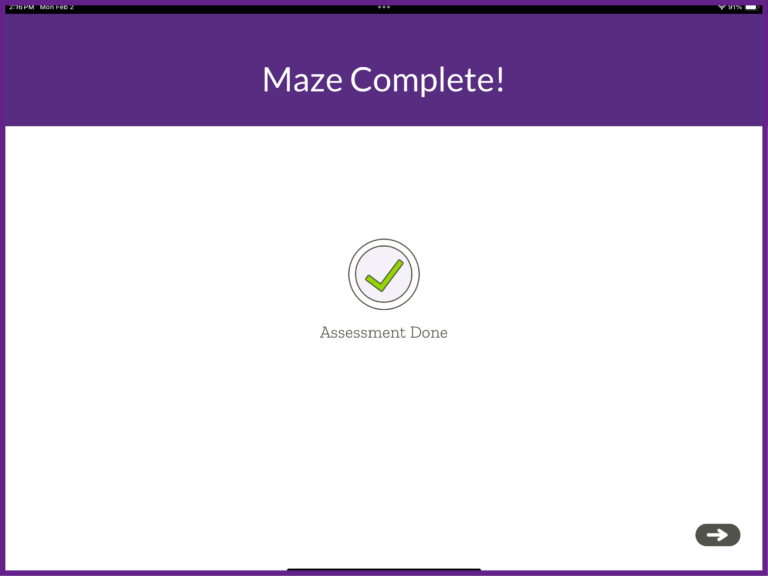 Students will complete the assessment on their devices. When time is up, ALO displays the “Maze Complete!” message. Students will click the arrow to return to the log in page. Assessment results are available immediately in ALO data views.