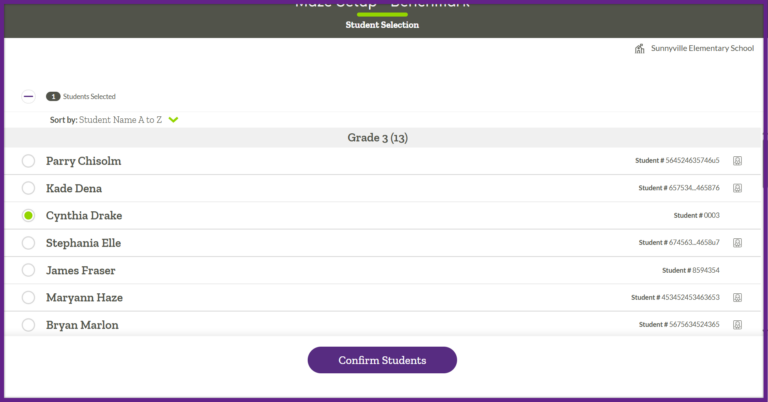 You will see a list of available students displayed. Select only those students who will be completing the assessment and click “Confirm Students.” You can skip ahead to the “Student Login Code” section below.
