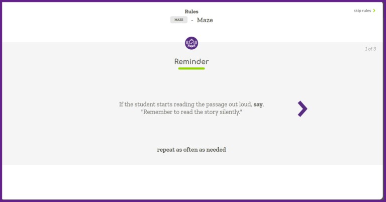 The Reminders and Wait Rules for Maze are displayed. You can scroll through the rules or skip them to proceed to administering the assessment.