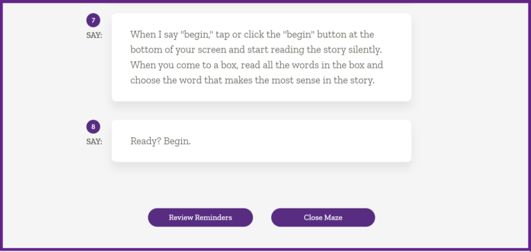 You will then tell students to click the arrow at the bottom of their screen. Proceed to read the directions verbatim to students and walk them through the practice activity. Continue reading the remaining directions to prompt students to begin the assessment. Once you reach the end of the directions you will have the option to review the reminders or to close Maze. Clicking “Close Maze” will not interfere with the student assessment.