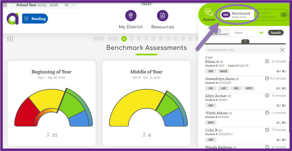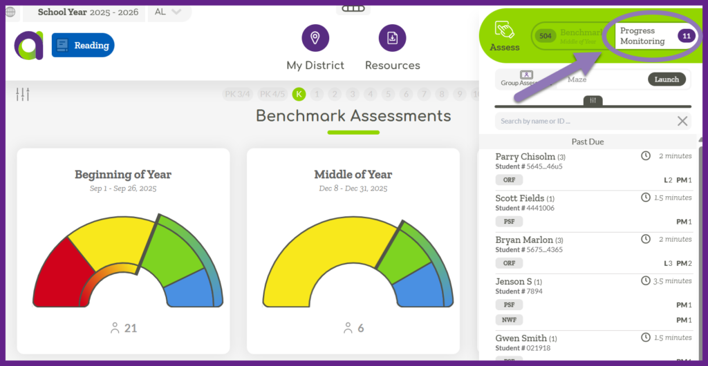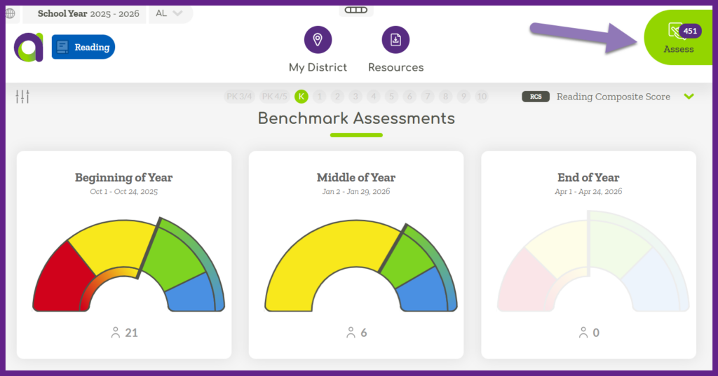 Within the Assess Sidebar you can administer Benchmark or Progress Monitoring assessments. The white background indicates which assessment is selected. Select which assessment type you would like to administer.