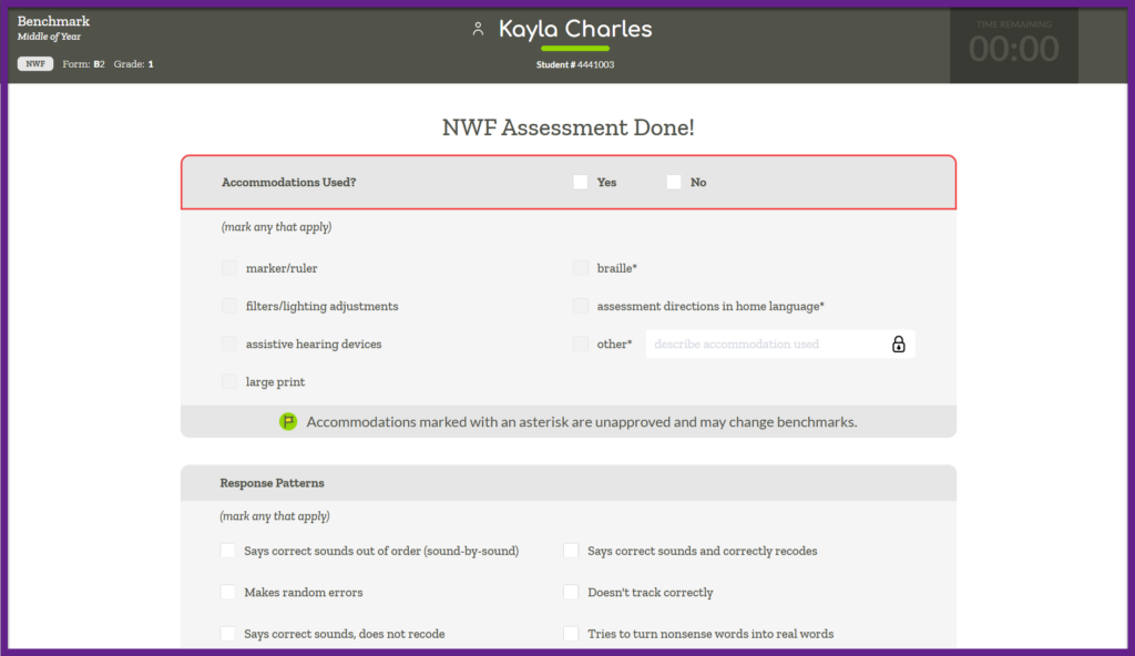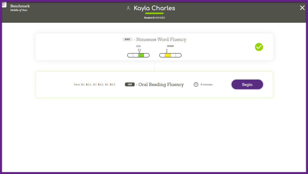 Ensure that you have the corresponding student facing materials available. Note that not all measures require student facing materials (FSF, PSF). For Benchmark assessments the G indicates grade level, and the B indicates which benchmark form [1- Benchmark 1 (BOY), 2 – Benchmark 2 (MOY), 3 – Benchmark 3 (EOY)]. For Progress Monitoring the number after L indicates which grade level material is needed and the number after PM indicates which progress monitoring form to use.