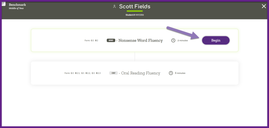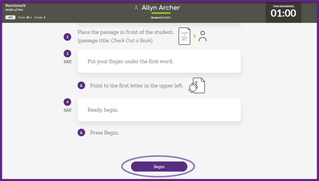 Follow the script that is displayed on the screen, ensuring you follow the prompts and read the text aloud verbatim. When prompted, click “Begin Practice Assessment” or “Next” at the bottom of the page. Follow all of the instructions until you reach the “Begin” button. Clicking the “Begin” button starts the assessment for all Acadience Reading K-6 and Acadience Math K-6 measures except Oral Reading Fluency (ORF). The timer for ORF administration begins when the student reads the first word and you mark the response in ALO.