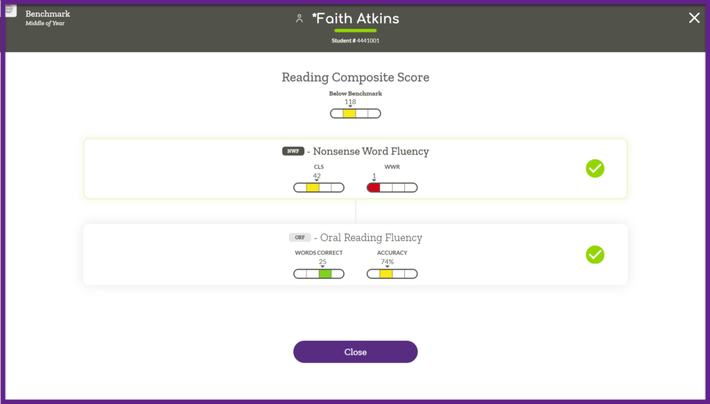 When the last Benchmark assessment is complete ALO will display the Reading or Math Composite score and all of the measure level scores for you to review. When you are finished reviewing, click “Close.” You will then be taken back to the previous screen you were on in ALO.