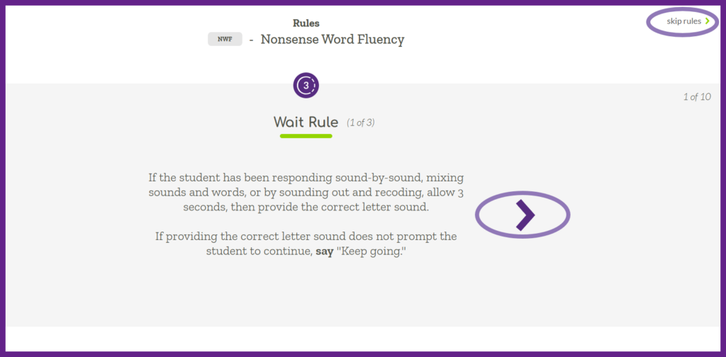 Rules and reminders are displayed for you to review. Click the purple arrows to scroll through and at the end click the “Next” button. Alternatively, in the top right corner you can click ‘skip rules’ to move past this section.