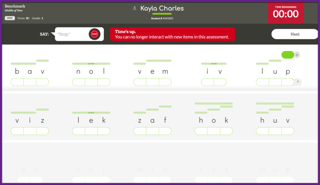 When time is up you can no longer interact with new items in the assessment. You can scroll up to previously marked responses and edit any of the existing scoring marks. Once you have reviewed the responses and everything is accurate click “Next” in the top right corner.